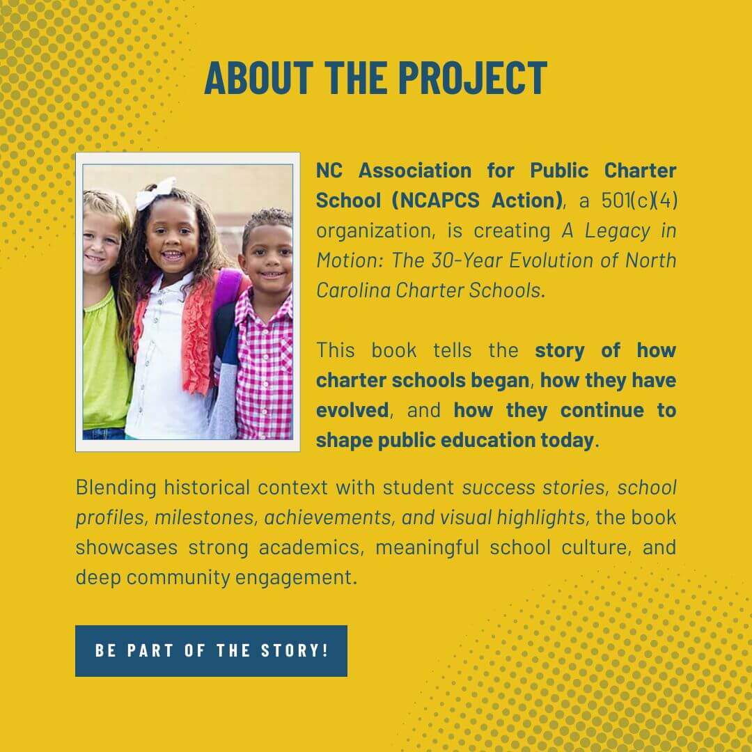 NCAPCS Action is an outgrowth of the NC Association for Public Charter Schools, the largest 501(c)(3) charter school nonprofit in North Carolina, which exists to advance quality educational opportunities for all North Carolina children by supporting and expanding successful charter schools.